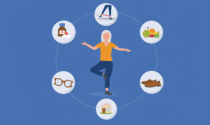Samenvatting valpreventie: Sta rustig op, gebruik de trapleuning, houd vloeren vrij, douche veilig en blijf bewegen.